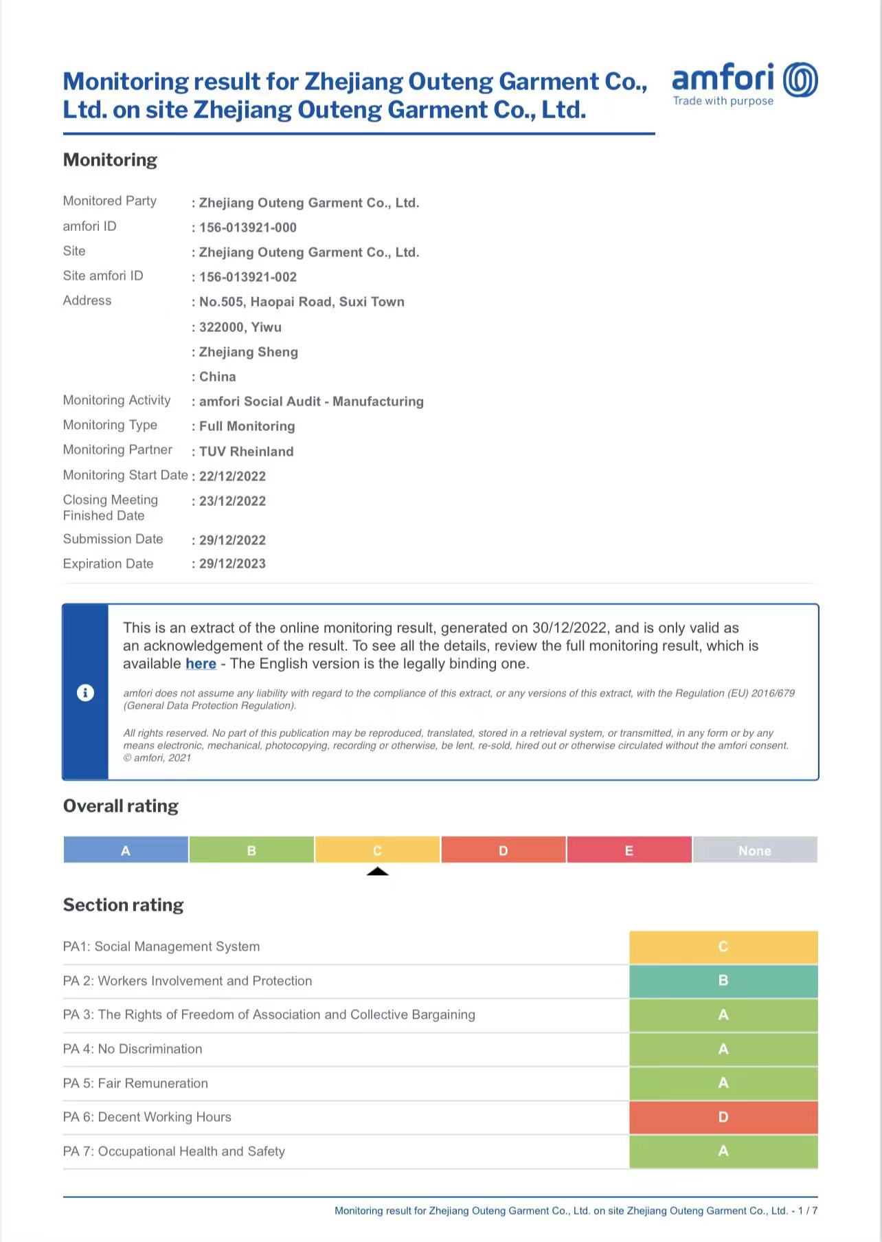 浙江歐騰服飾有限公司位于世界小商品之都-義烏。創立于2015年,是一家專業生產無縫針織運動服飾和內衣的工貿一體企業,擁有自主出口權。 工廠的占地面積約16000平方米 ,引進了大型圣東尼、高騰等多種先進的制衣設備300余臺。月產能可達90萬件。 歐騰服飾每年投入近百萬資金打樣開發新產品,有著一支高素質設計、技術員工隊伍。工廠先后通過了ISO 9001質量管理體系認證、BSCI認證、GRS認證、OEKO-TEX國際生態紡織品認證等多項專利檢測報告。可提供OEM&ODM服務。歐騰服飾以一套完整、科學的質量管理體系,生產的服裝從原材料紗線到成衣,質量完全能夠滿足國內、國際質量要求。獲得了客戶一致好評。工廠先后獲得省科技型企業、國家高新企業、義烏市誠信講信用單位、規上企業、信用AAA級等榮譽。